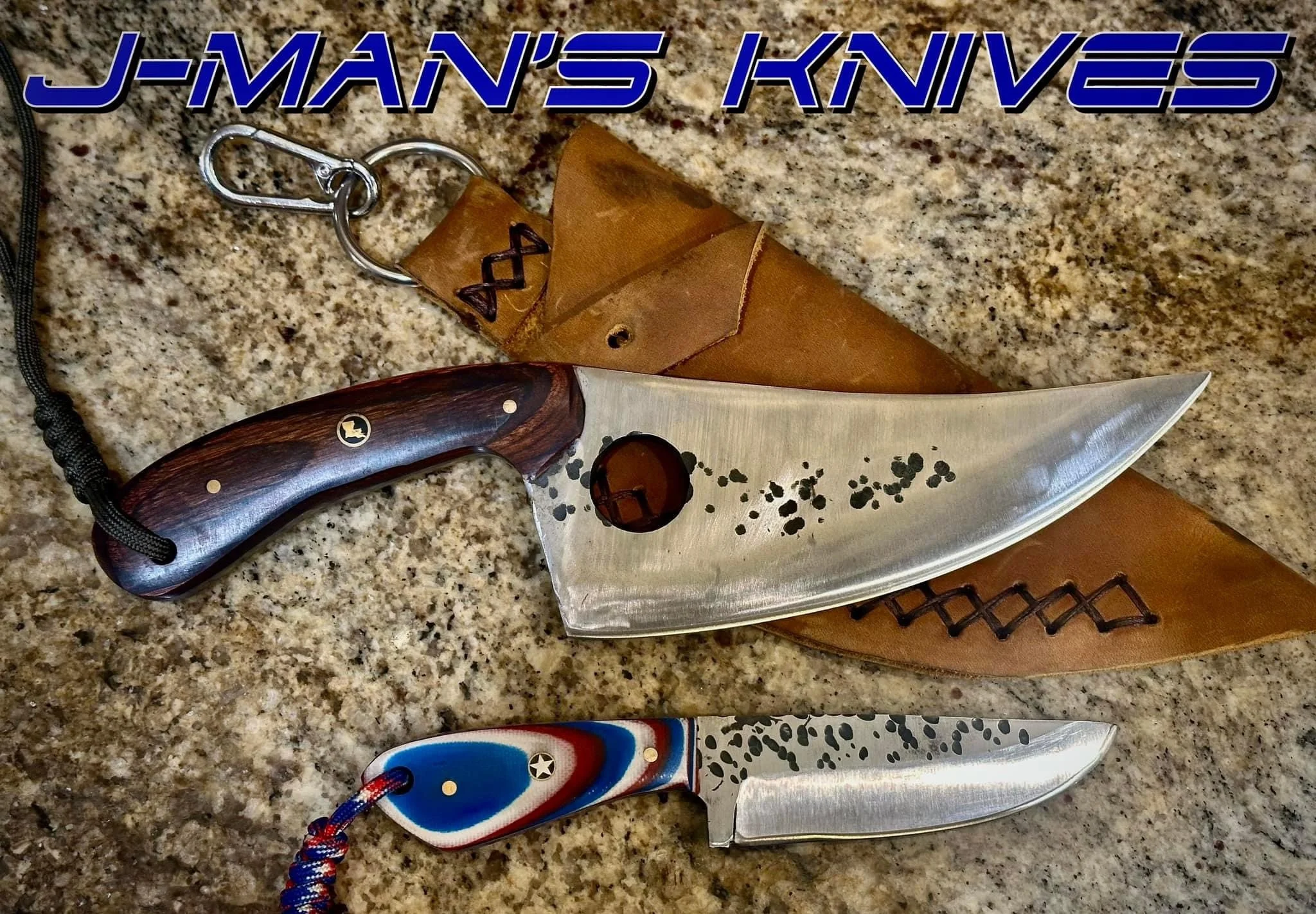 Custom Knives * Custom Knives * Custom Knives * CUSTOM KNIVES BY J-MAN 80CRV2 W/COCOBOLO HANDLE AND BRASS GUARD 1095 W/OAK HANDLE AND LEATHER SHEATH 80CRV2 W/ BUFFALO HORN /COCOBOLO HANDLE AND LEATHER SHEATH 1095 W/ EBONY HANDLE AND LEATHER SHEATH 80CRV2 W/EPOXY HANDLE AND BRASS GUARD 1095 1%ER SKINNERS/ CUSTOM MOSAIC PINS 1%ER SKINNER 8CRV2 g10 handle Skinner Small skinner Large hunter 80CRV2 G10 handles 80CRV2 CUSTOM 80CRV2 CUSTOM MINI Cleaver 1095 80CRV2 w/ pearl epoxy handle 80CRV2 w/ ebony wood handle ORDER A KNIFE For Custom Knife Orders or any questions, you can contact me at: jmansknives@gmail.com MEMBER